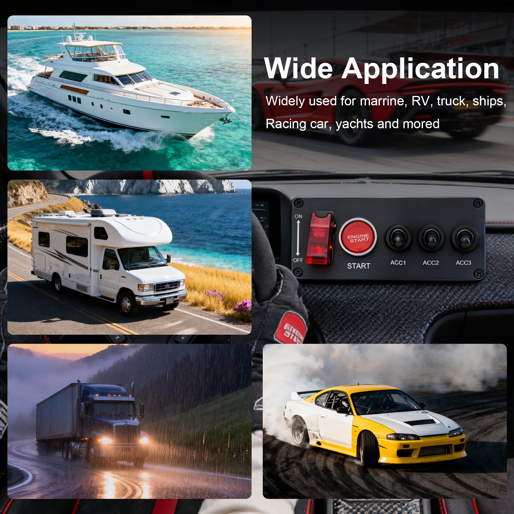• Excellence Design: The switch panel adopts high quality design of 5 in 1, including 1 on/off main toggle switch with safety cover, 1 red engine start button, 3 x toggle switches for additional use, and equipped with 12AWG relay kit control button function