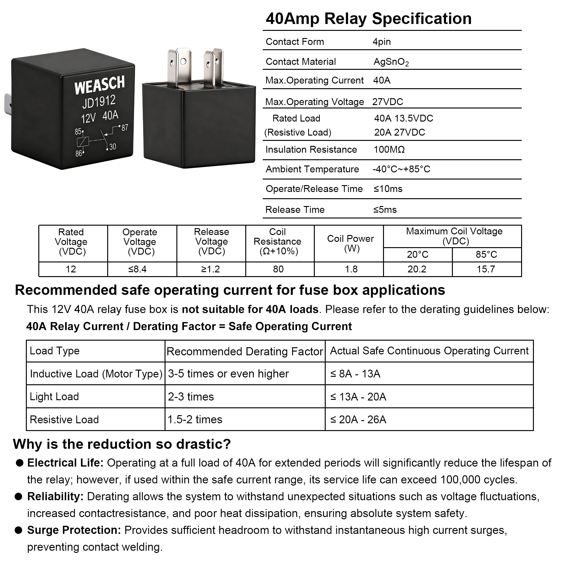 Weasch 12V Pre-Wired Fuse Relay Box, 4-Pin 40A Relay Block and Kit, 2 Relays and 6 ATC/ATO Blade Fuses, for Cars Truck Marine Boat Jeep-1