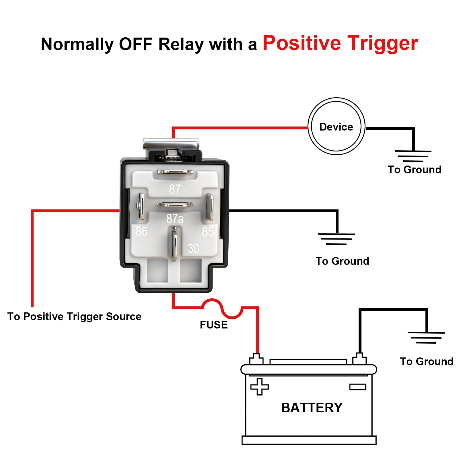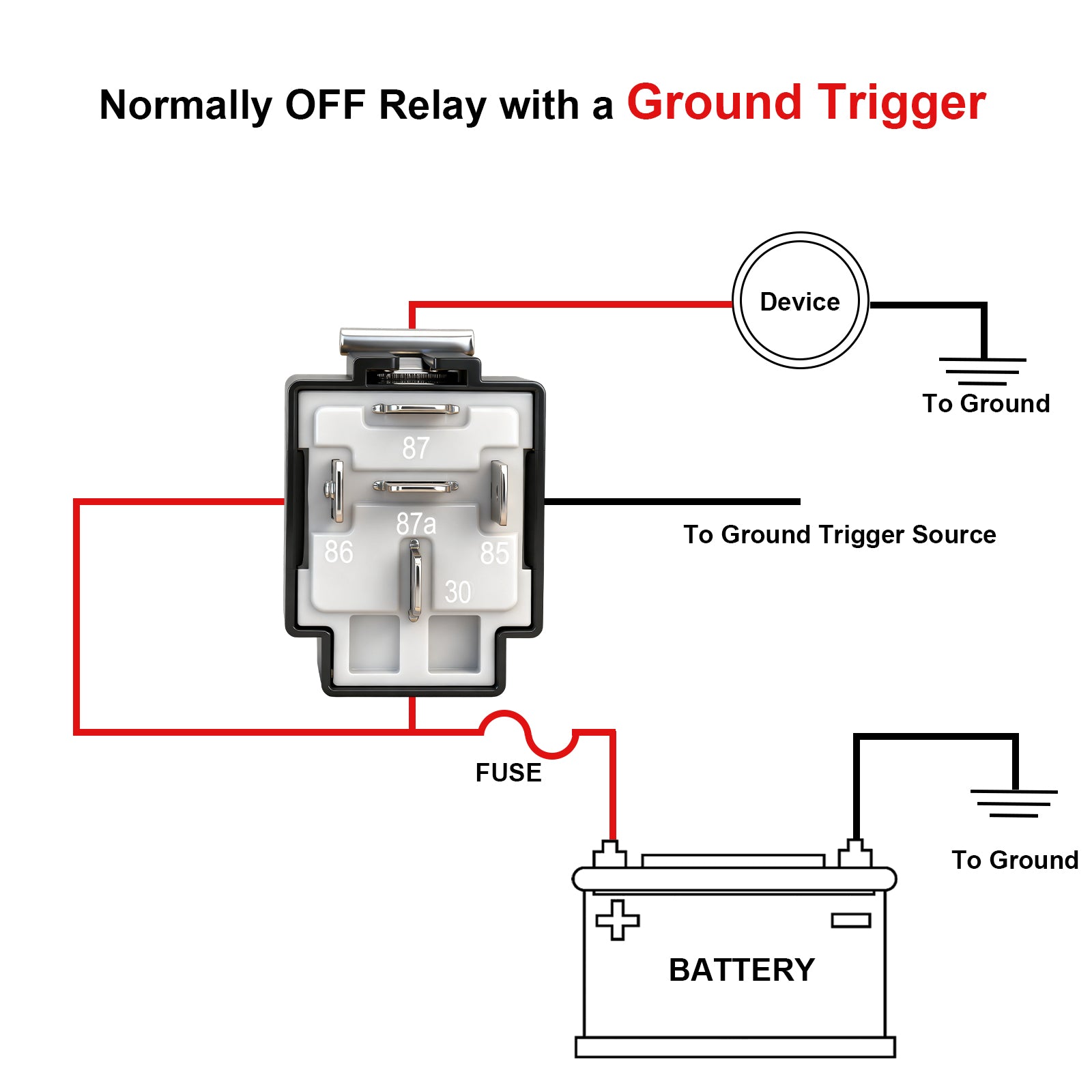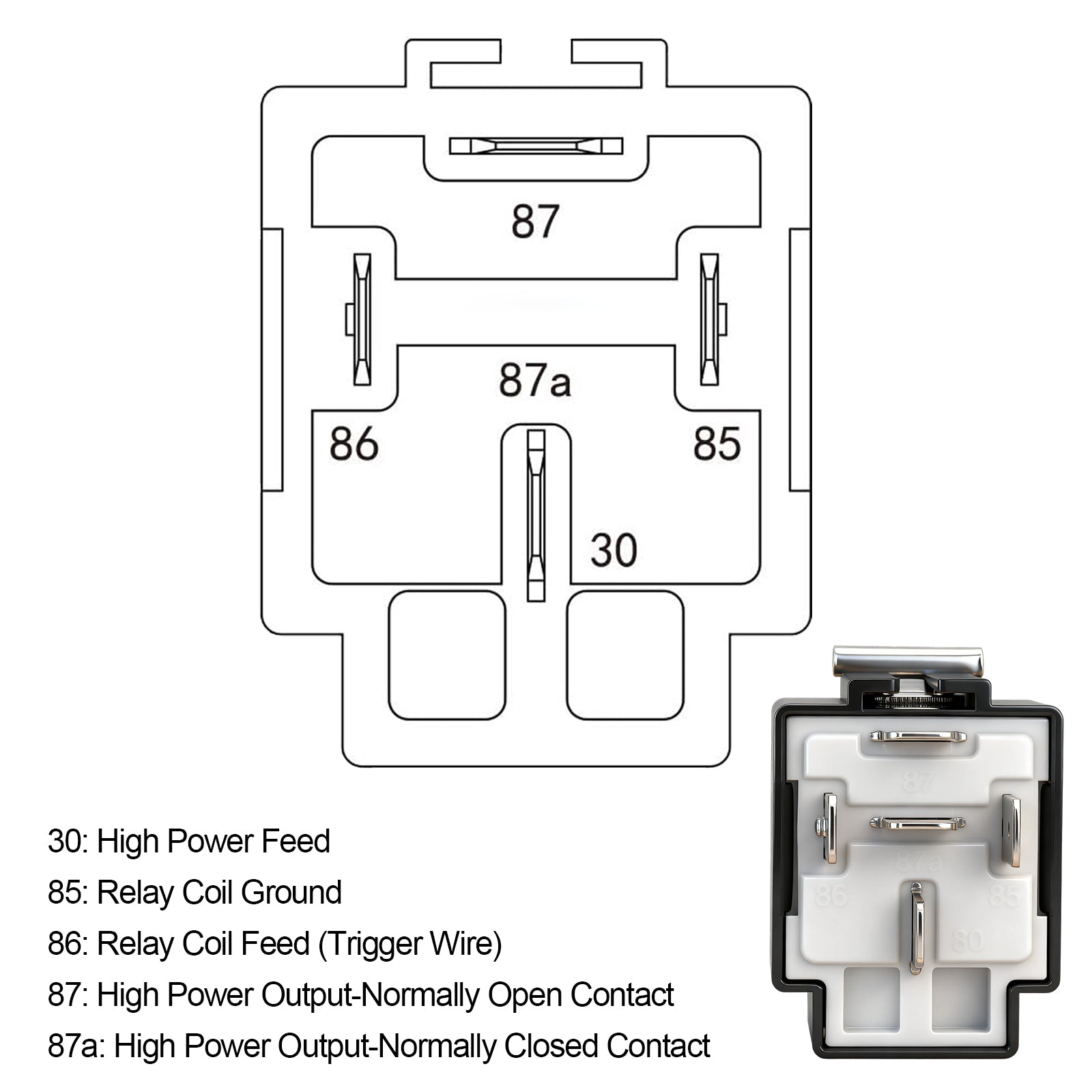• Black - Ground (85), Red - VDC (30), White - Trigger (86), Blue - Output N/O (87), Green- Output Closed Contact (87a)